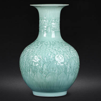 Vintage big celadon lotus carved textured glazed ceramic vase ornament
