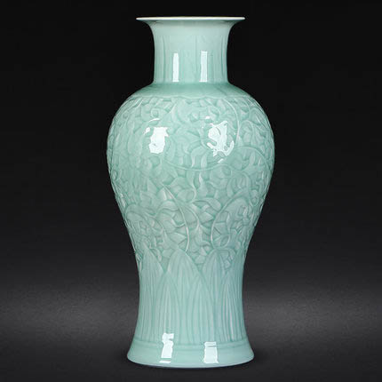 Vintage big celadon lotus carved textured glazed ceramic vase ornament
