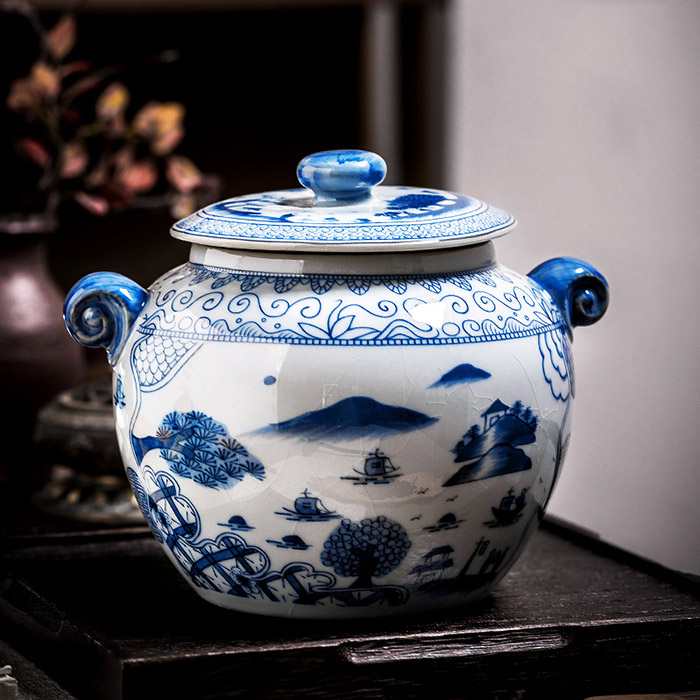 Jingdezhen big blue and white sealed ceramic tea storage jar ornament