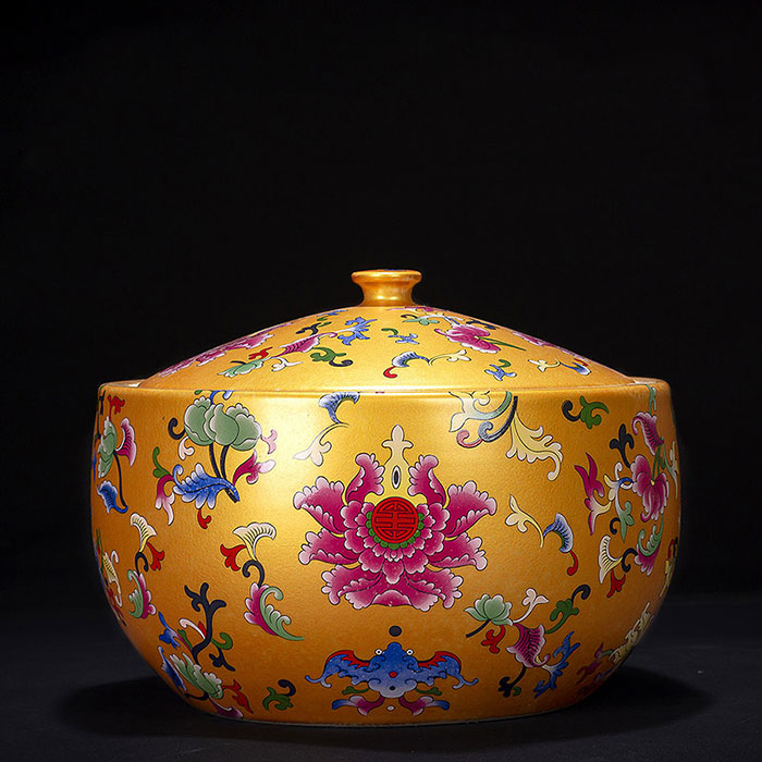 Antique yellow human made sealed enamel cornucopia ceramic storage pot