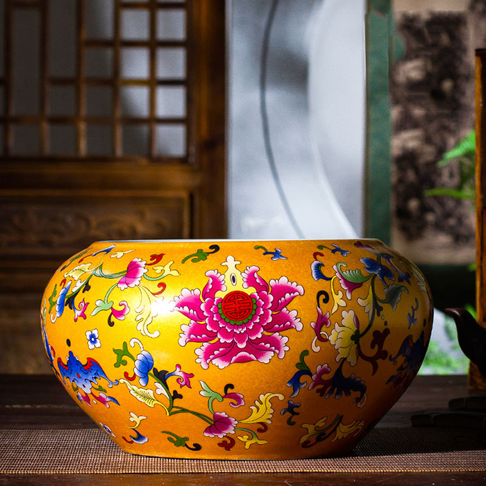 Small bright yellow enamel cornucopia ceramic pots and ornaments