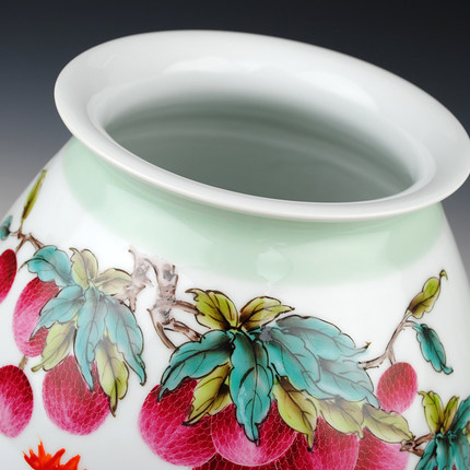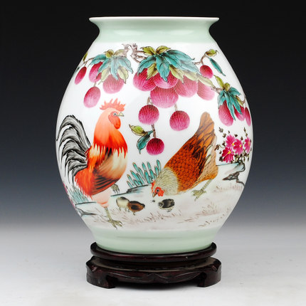 Designer hand painted ceramic flower vase with chickens and lychees