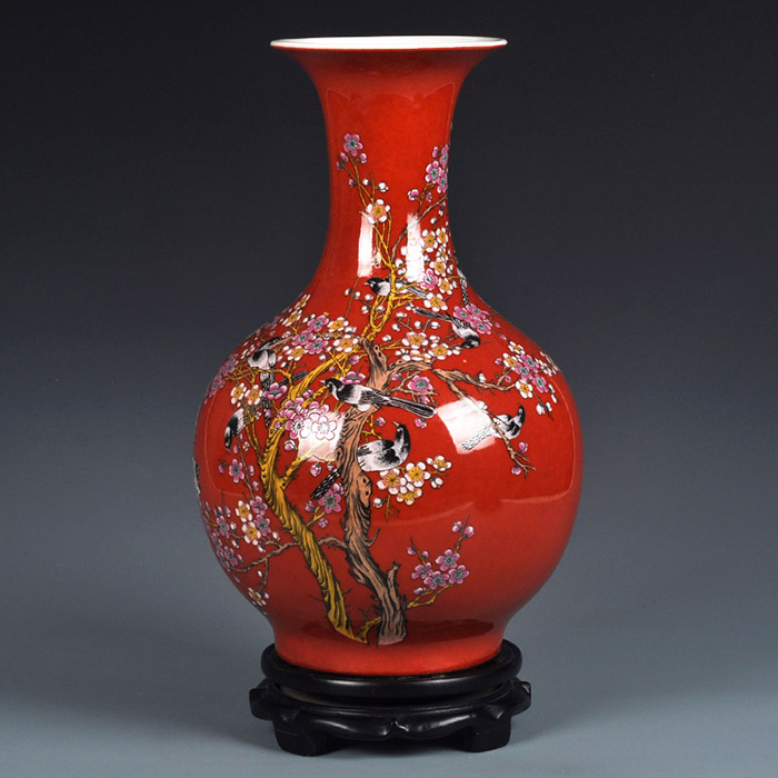 Jingdezhen modern decorative red ceramic vase with birds and flowers