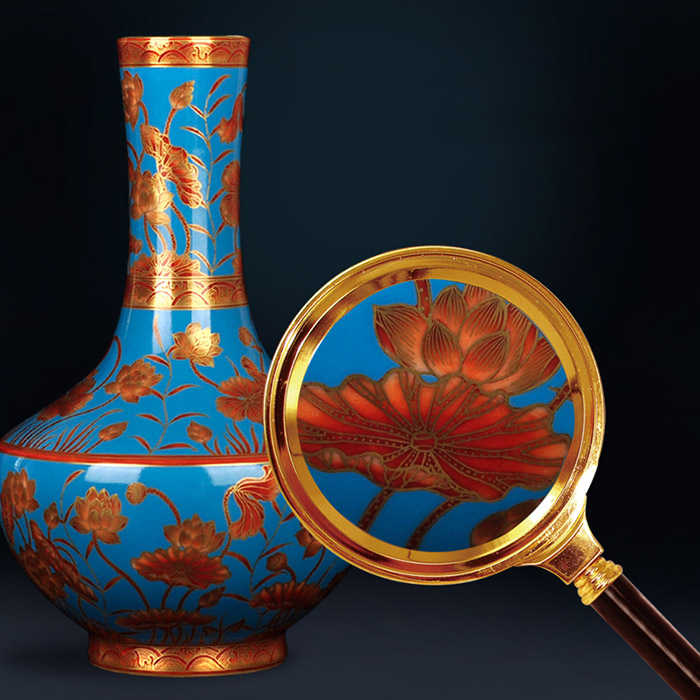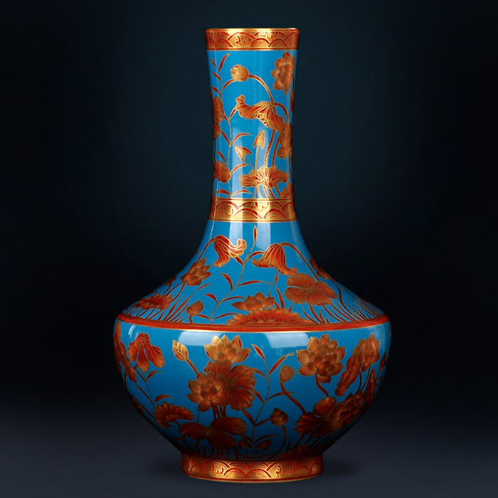 Vintage hand-painted lotus pattern with golden color blue ceramic vase