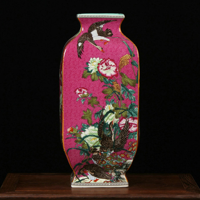 Pastel peony flower and bird chinese landscape majolica pottery vase