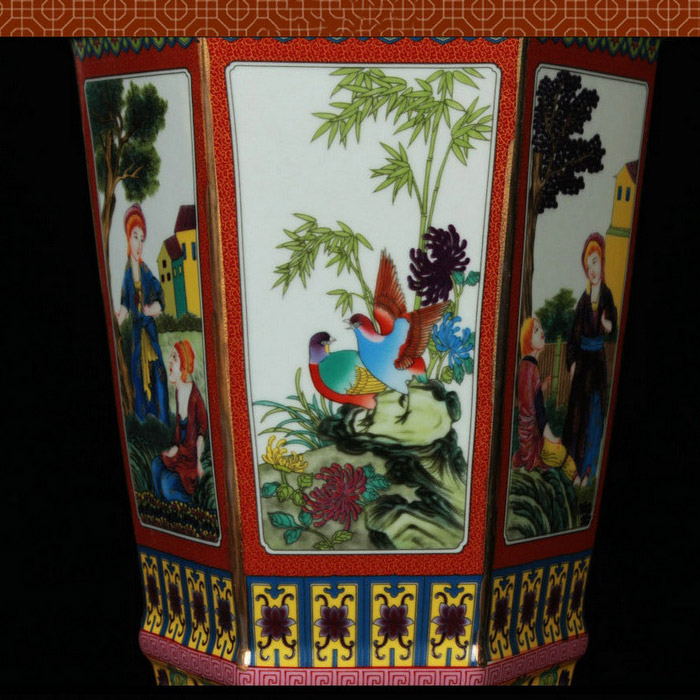 European enamel Ladies figure hexagonal porcelain flower vase ornament
