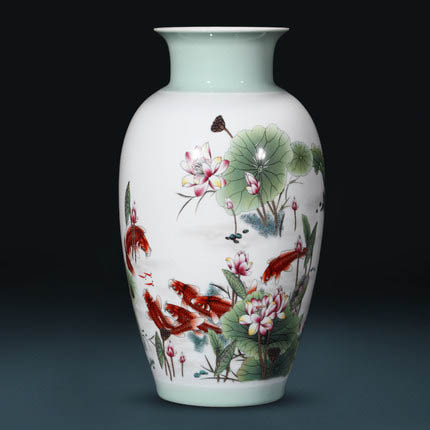 Designer pastel ceramic flower vase and ornament with fish and lotus