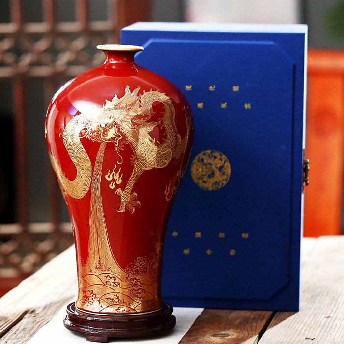 Jingdezhen hand painted red mermaid dragon ceramic vase outline gold