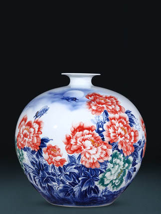 Designer big hand painted peonies pattern red in glaze porcelain vase