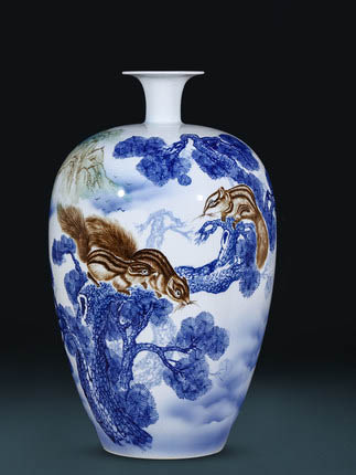 Large hand painted golden squirrel blue and white porcelain vase
