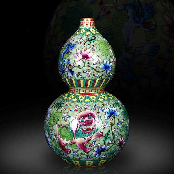 Enamel green lion auspicious gold painted ceramic vases ornaments