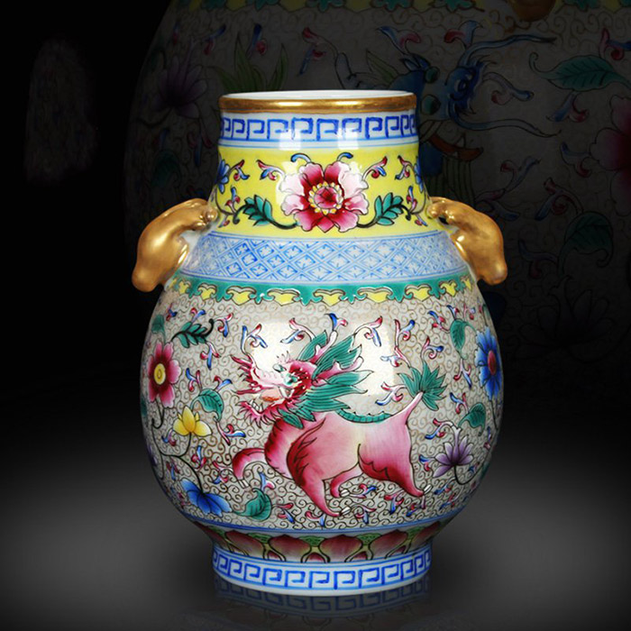 Enamel phoenix hair and kirin horns gilt double-eared deer head vase
