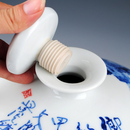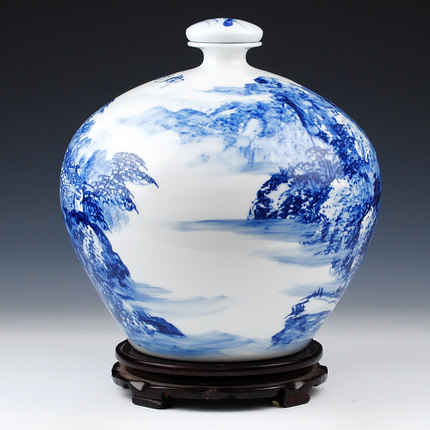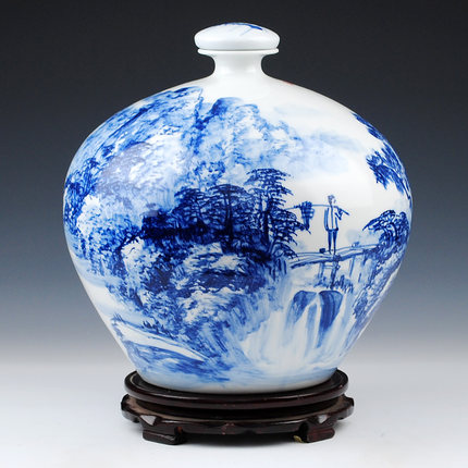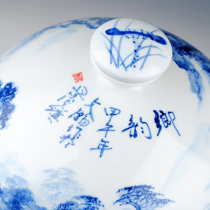 Designer hand painted blue and white landscape ceramic storage jar