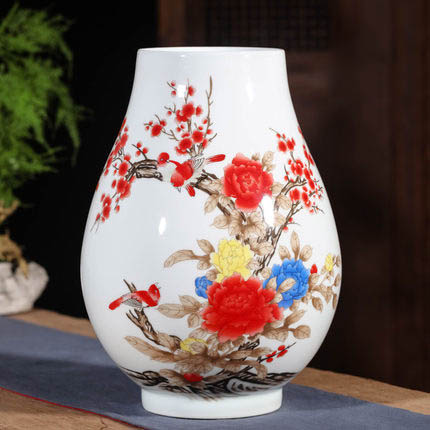 Jingdezhen barrel shape ceramic vase with birds and red flowers home