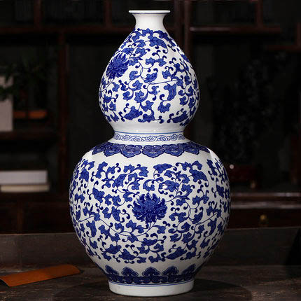 Vintage ornamental tall floor blue and white ceramic flower vase