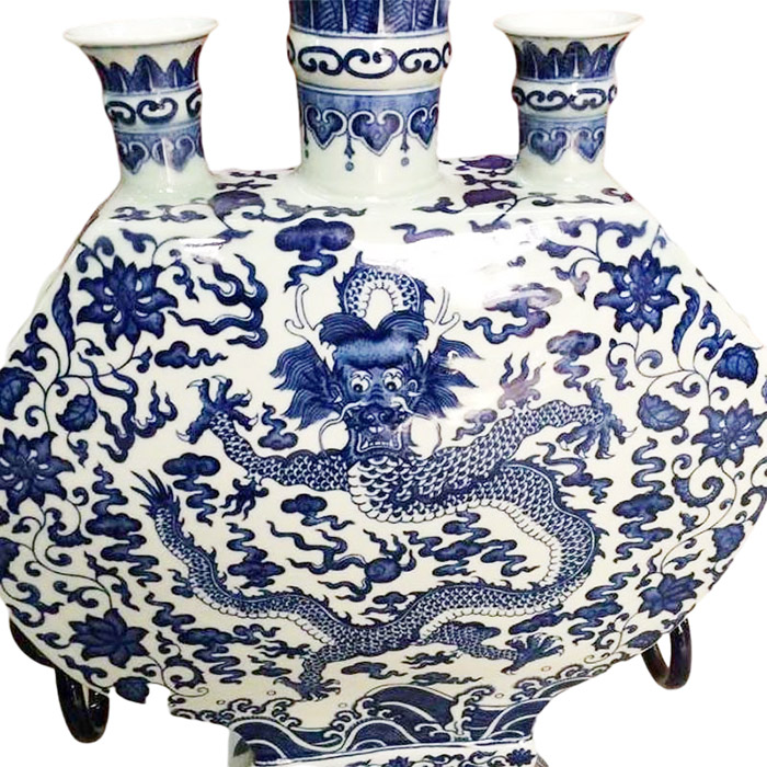Vintage hand-painted blue and white dragon pattern five holes flat pot