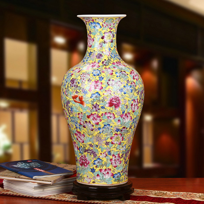 Hand painted tall pastel yellow bottom floor standing vase with flower