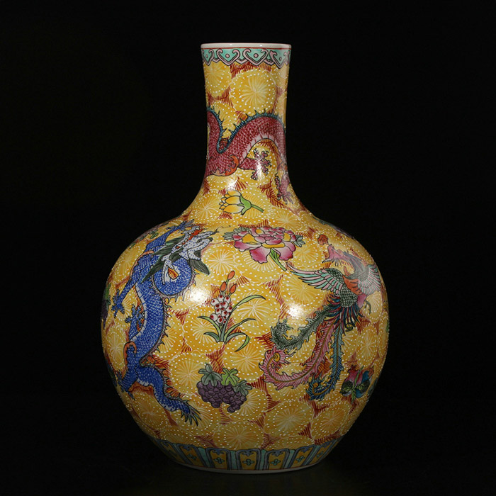 Large enamel pastel dragon and phoenix floor standing vase living room