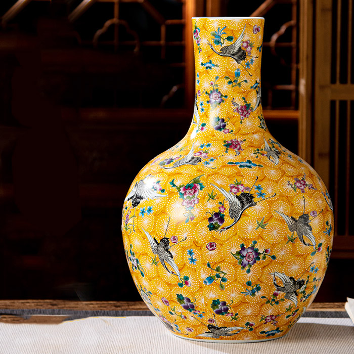Vintage chinese yellow ceramic vase with birds and flowers living room