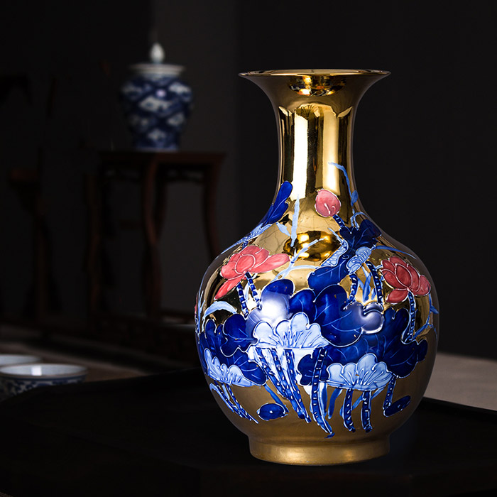 Vintage Chinese jingdezhen gold background blue enamel ceramic vase