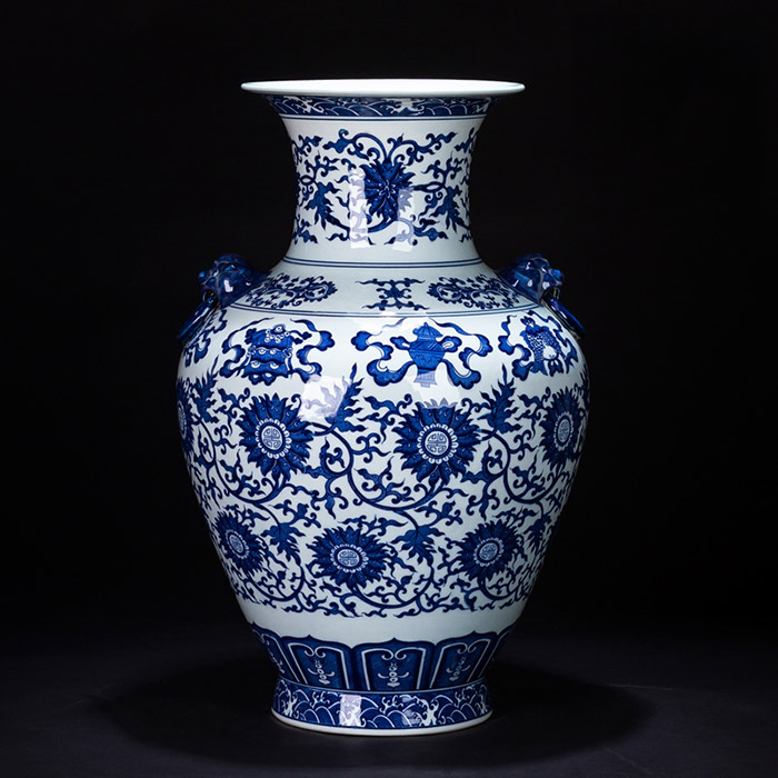 Blue and white double-eared lion head 8 treasure floor porcelain vase