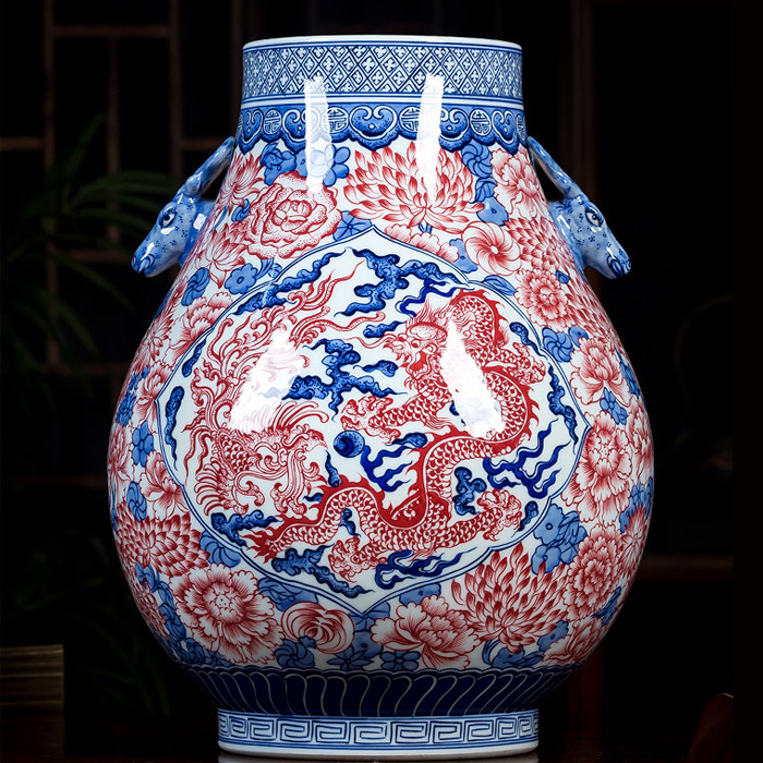 Hand-painted bucket shape red dragon blue and white enamel vase