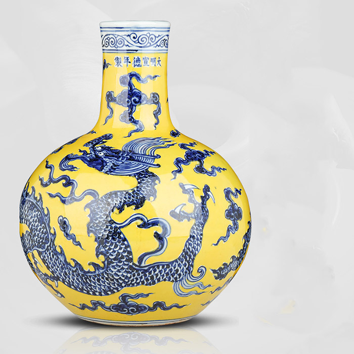 Vintage ming dynasty xuan de yellow background ceramic vase dragon on